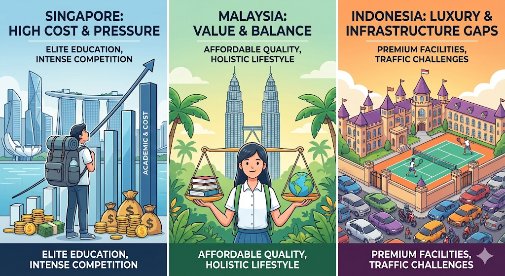 "싱가포르의 숨 막히는 경쟁, 말레이시아의 가성비, 인도네시아의 극과 극 환경."