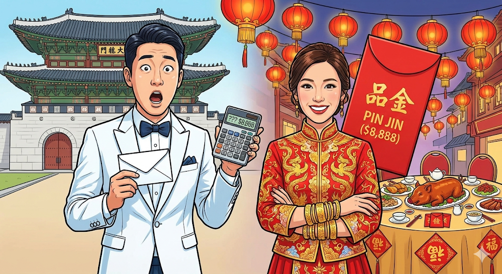 - 한국 남성분들, 여기서 "왜 돈을 줘야 해?"라고 따지면 결혼 못 합니다. 화교 문화에서 **'핀진(聘金)'**은 신랑이 신부를 키워준 처가에 보내는 **'감사의 표시'**이자, 처가의 **'체면(Face Value)'**을 세워주는 척도입니다.